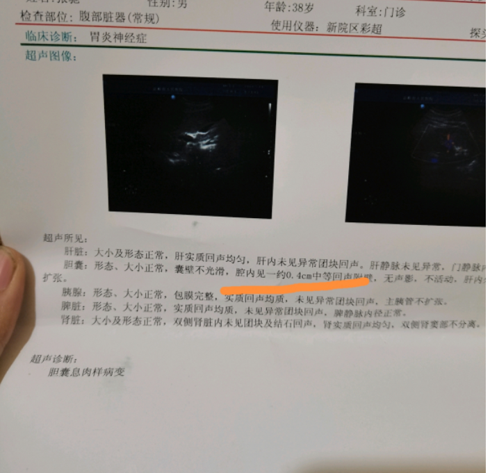 一直到2023年初,有天晚上突然疼得特别厉害,胃药完全没用,脸色发白还直冒冷汗。我媳妇吓得赶紧叫了救护车。到了急诊,做完B超才知道是急性胆囊炎,还有多发性胆囊息肉,最大的0.4cm。